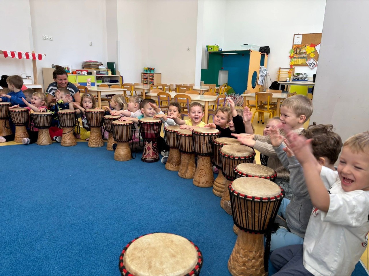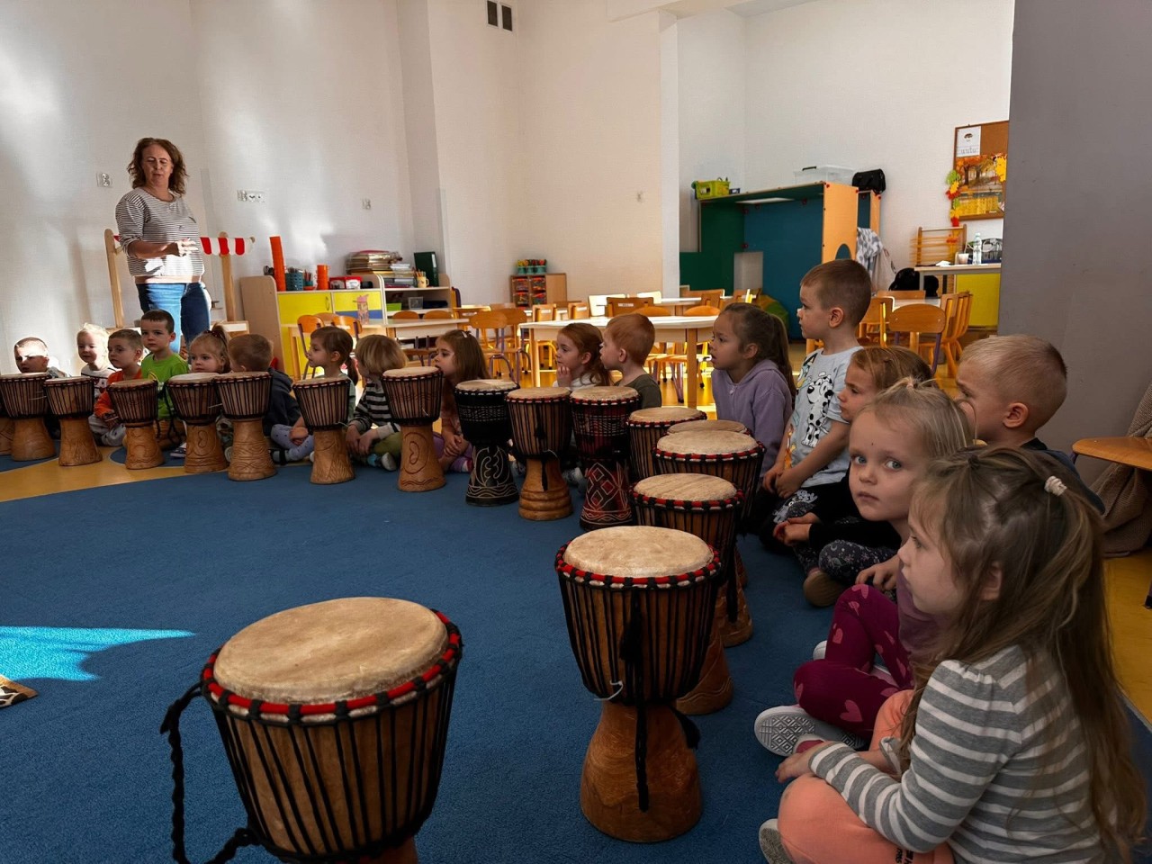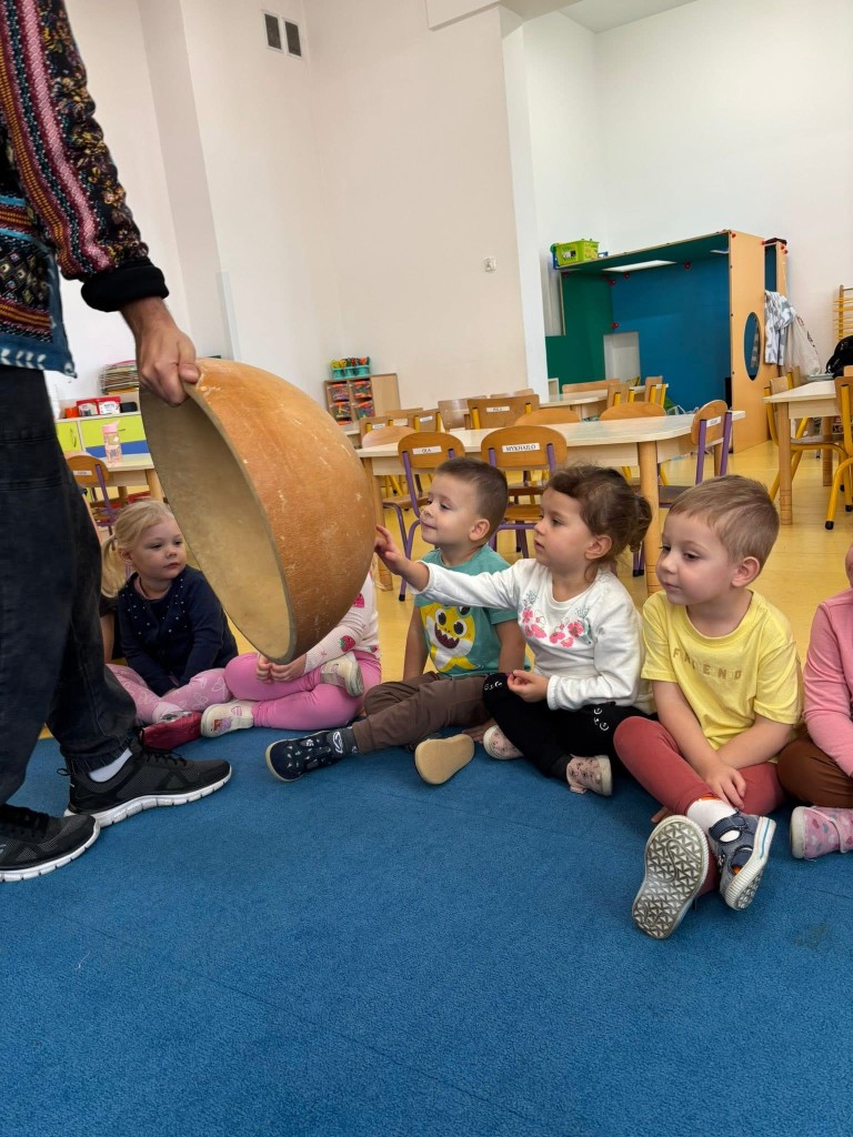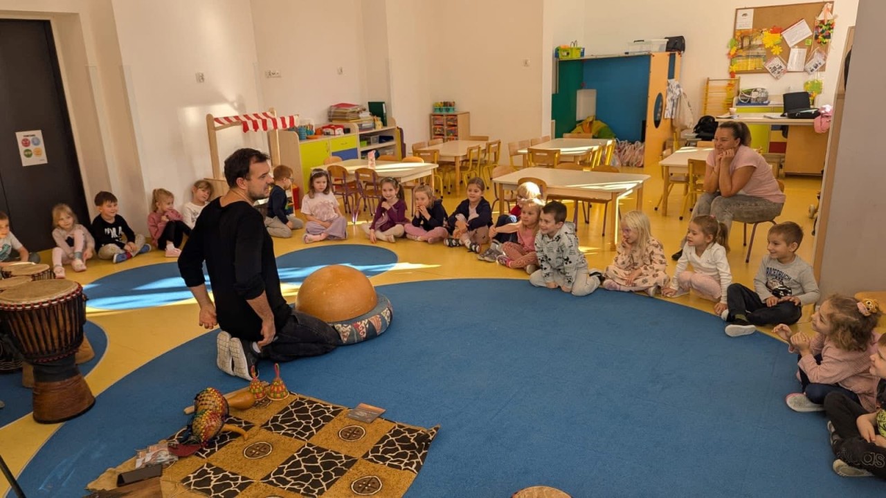 W naszym przedszkolu odbyły się wyjątkowe warsztaty bębniarskie w ramach cyklu „Spotkania z Afryką”, które poprowadził pan Łukasz Dembiński. Dzieci miały okazję poznać różnorodne instrumenty pochodzące z Afryki oraz dowiedzieć się wielu ciekawostek o tamtejszej kulturze i muzyce. Pan Łukasz w interesujący sposób opowiadał o afrykańskich tradycjach, życiu mieszkańców różnych regionów oraz o tym, jak ważną rolę w ich codzienności odgrywa muzyka. Każde dziecko mogło spróbować swoich sił w grze na bębnach i poczuć radość wspólnego tworzenia rytmu – było głośno, radośnie i bardzo rytmicznie!