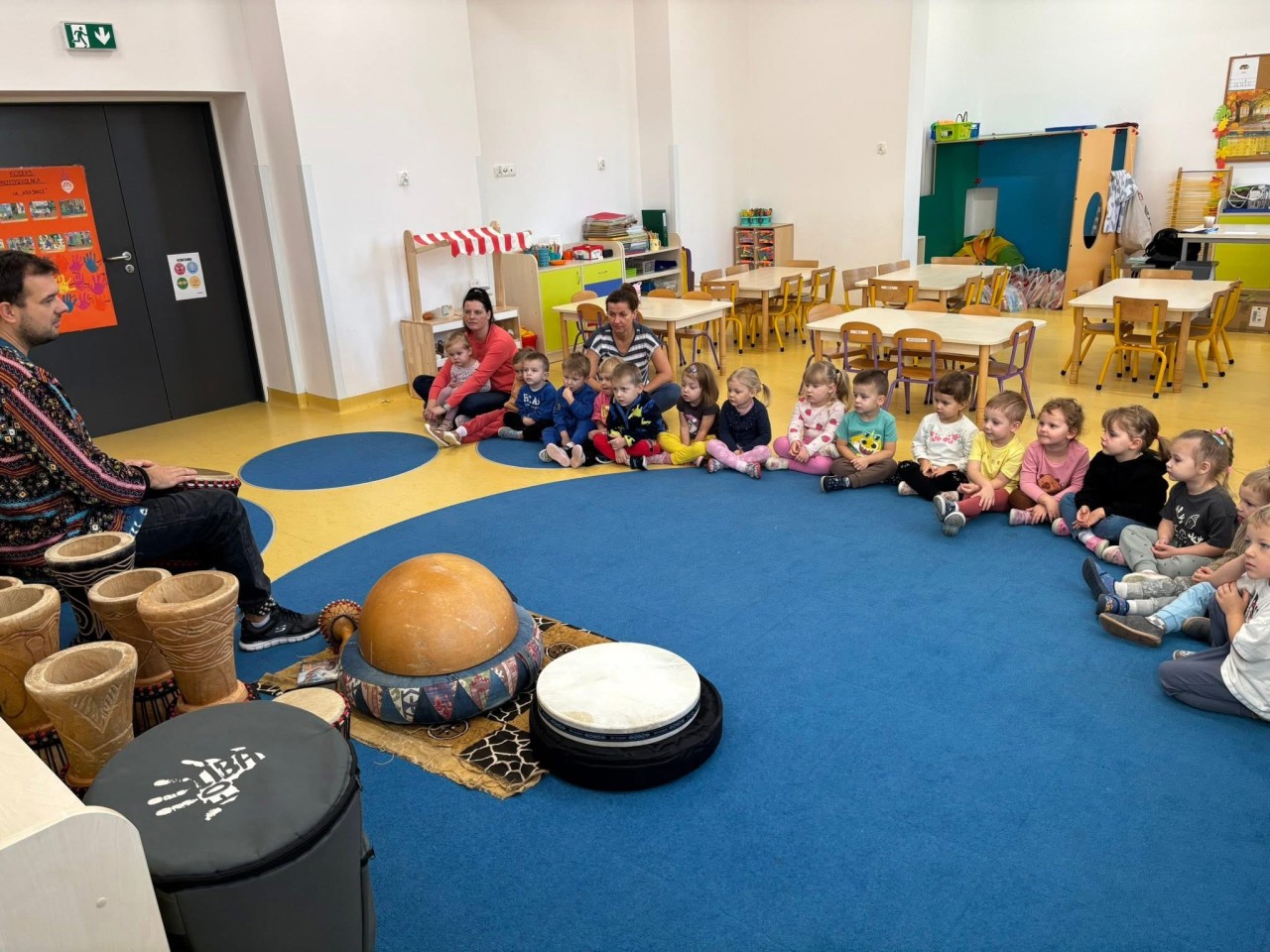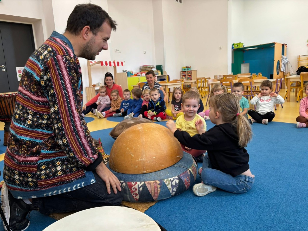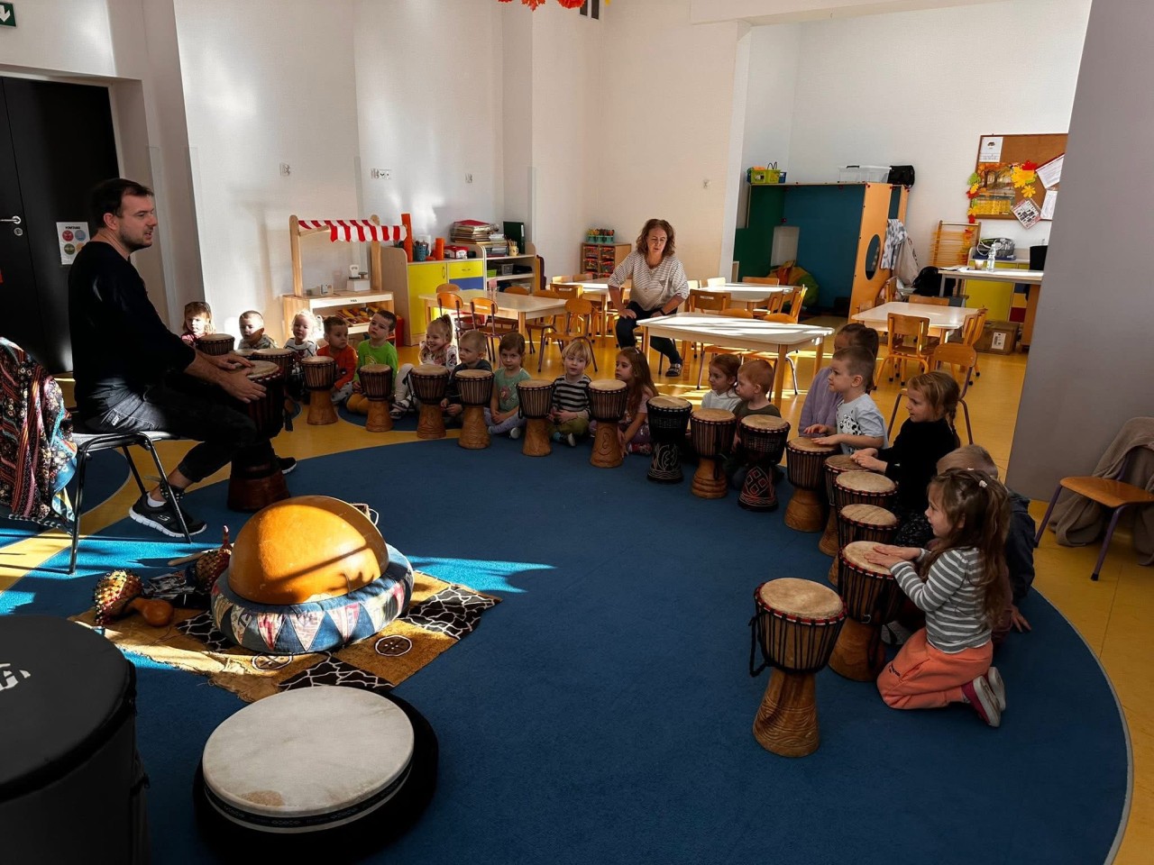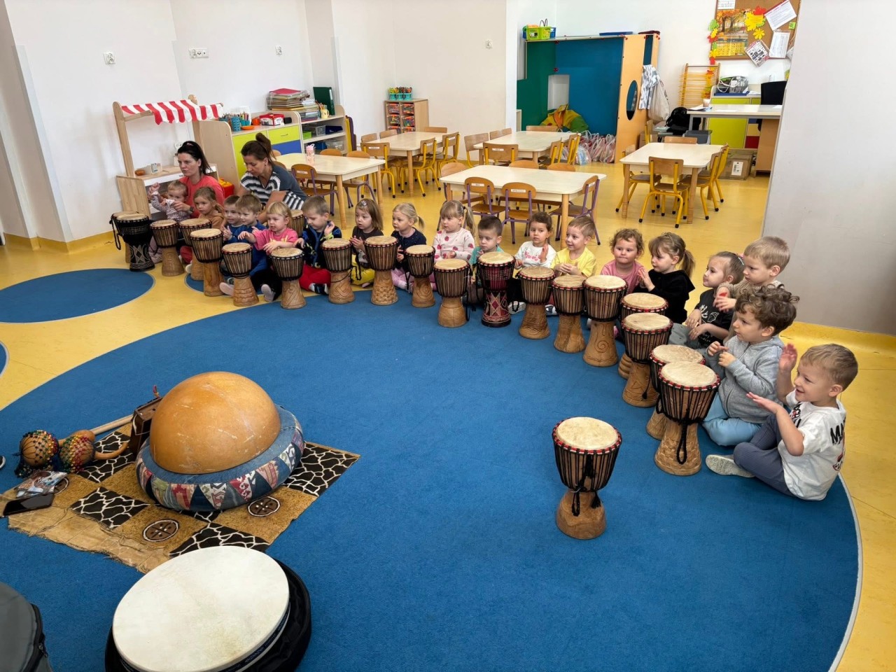 W naszym przedszkolu odbyły się wyjątkowe warsztaty bębniarskie w ramach cyklu „Spotkania z Afryką”, które poprowadził pan Łukasz Dembiński. Dzieci miały okazję poznać różnorodne instrumenty pochodzące z Afryki oraz dowiedzieć się wielu ciekawostek o tamtejszej kulturze i muzyce. Pan Łukasz w interesujący sposób opowiadał o afrykańskich tradycjach, życiu mieszkańców różnych regionów oraz o tym, jak ważną rolę w ich codzienności odgrywa muzyka. Każde dziecko mogło spróbować swoich sił w grze na bębnach i poczuć radość wspólnego tworzenia rytmu – było głośno, radośnie i bardzo rytmicznie!
